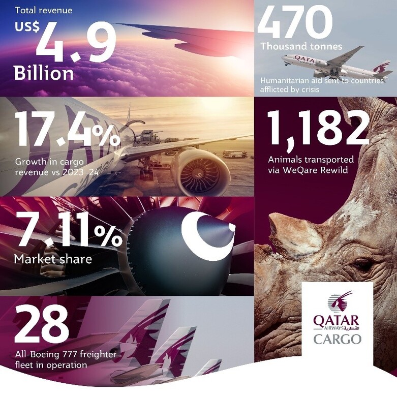 Qatar Airways Cargo announced another record-breaking annual result – its best since the pandemic, revealing a 17.4% growth in cargo revenue and registering 1.5 million tons of transported chargeable weight. It continues to hold 7.11% of the global air cargo market, serving 60+ freighter with its fleet of 28 Boeing 777 freighters, and a belly-capacity network to 160 passenger destinations. New freighter services were launched to Abu Dhabi, Sharjah, Vienna, Kuala Lumpur, and London, and frequencies to China and Hong Kong increased. The cargo carrier says its success is due to “a bold strategy, relentless innovation, and unmatched operational reliability” and underlines the importance of “impact”. It cites a cargo uplift of 470,000 kg of humanitarian aid over the year, delivered free of charge under its WeQare program in partnership with UNHCR, Airlink and other global NGOs. Its WeQare “Rewild the Planet” chapter also saw 1182 animals being carried at no cost, on behalf of United for Wildlife and Animal Defenders International, among others. “Special cases included 47 ring-tailed and brown lemurs, 155 radiated tortoises, 757 spider tortoises and seven lions.”