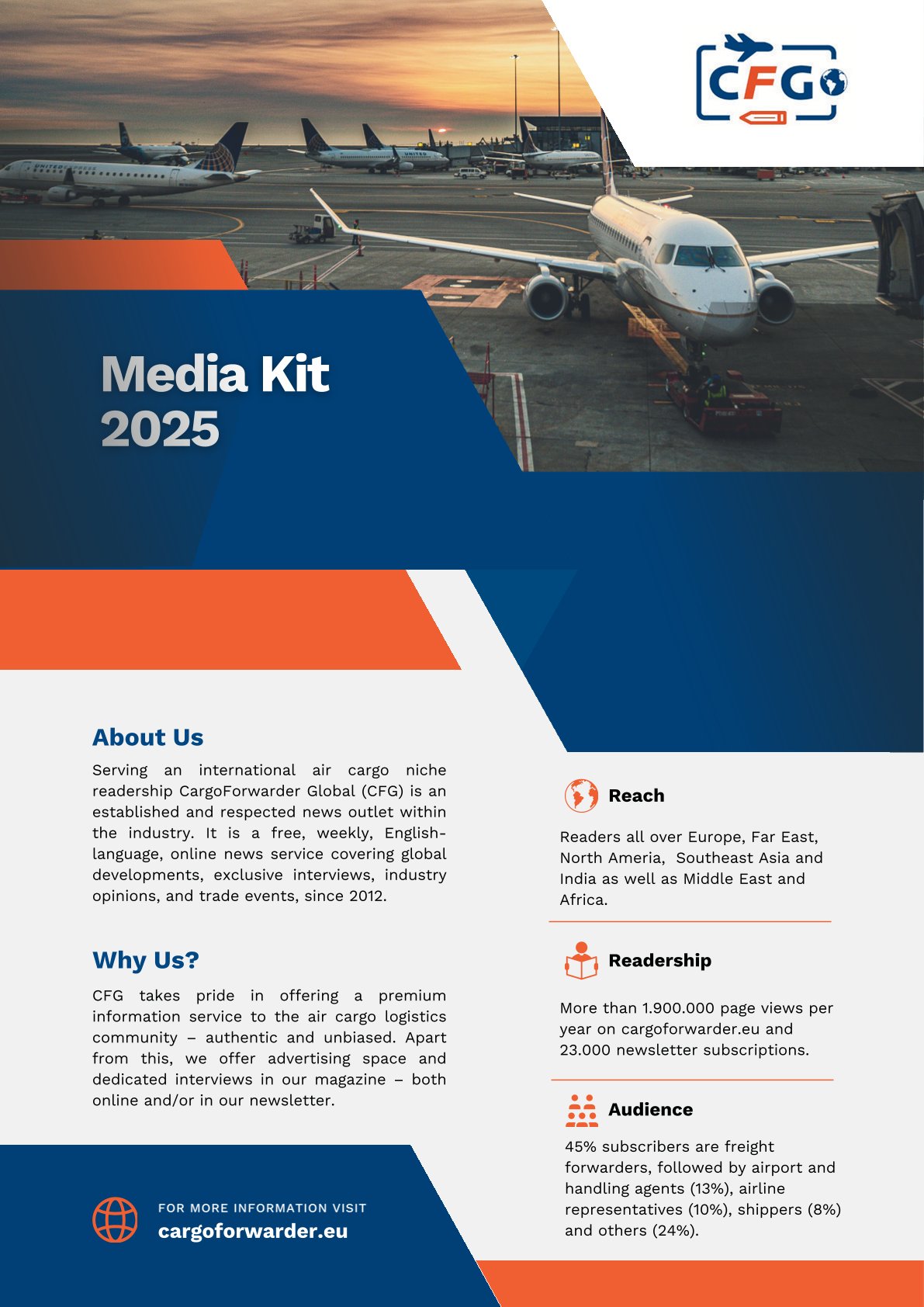 Place an ad in CargoForwarder Global (CFG), and attract key industry decision makers across the world every Sunday evening (CET), when our email NewsMail goes out. Or you can opt to place a more permanent ad on our CFG website and be seen every time someone clicks on an article link.